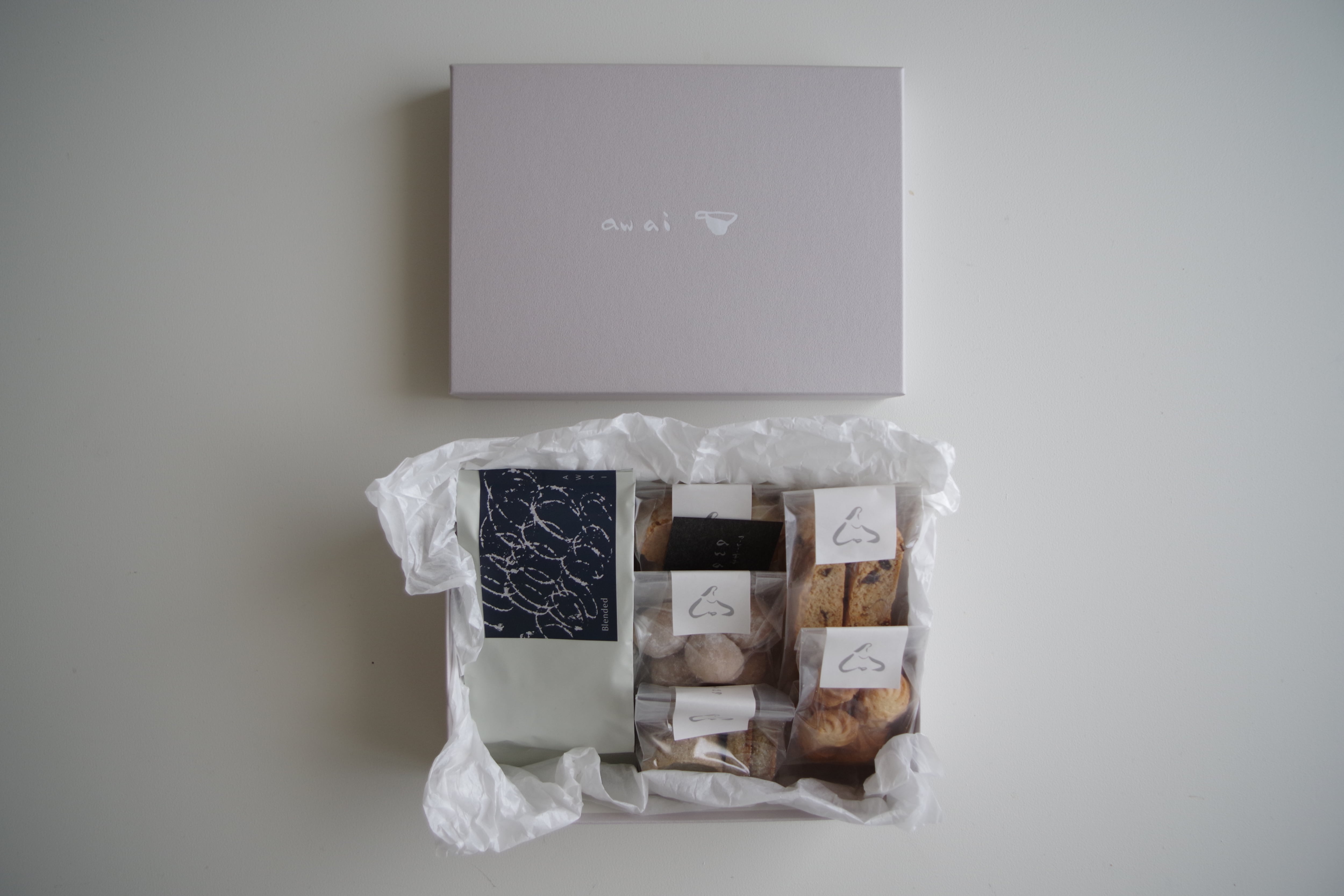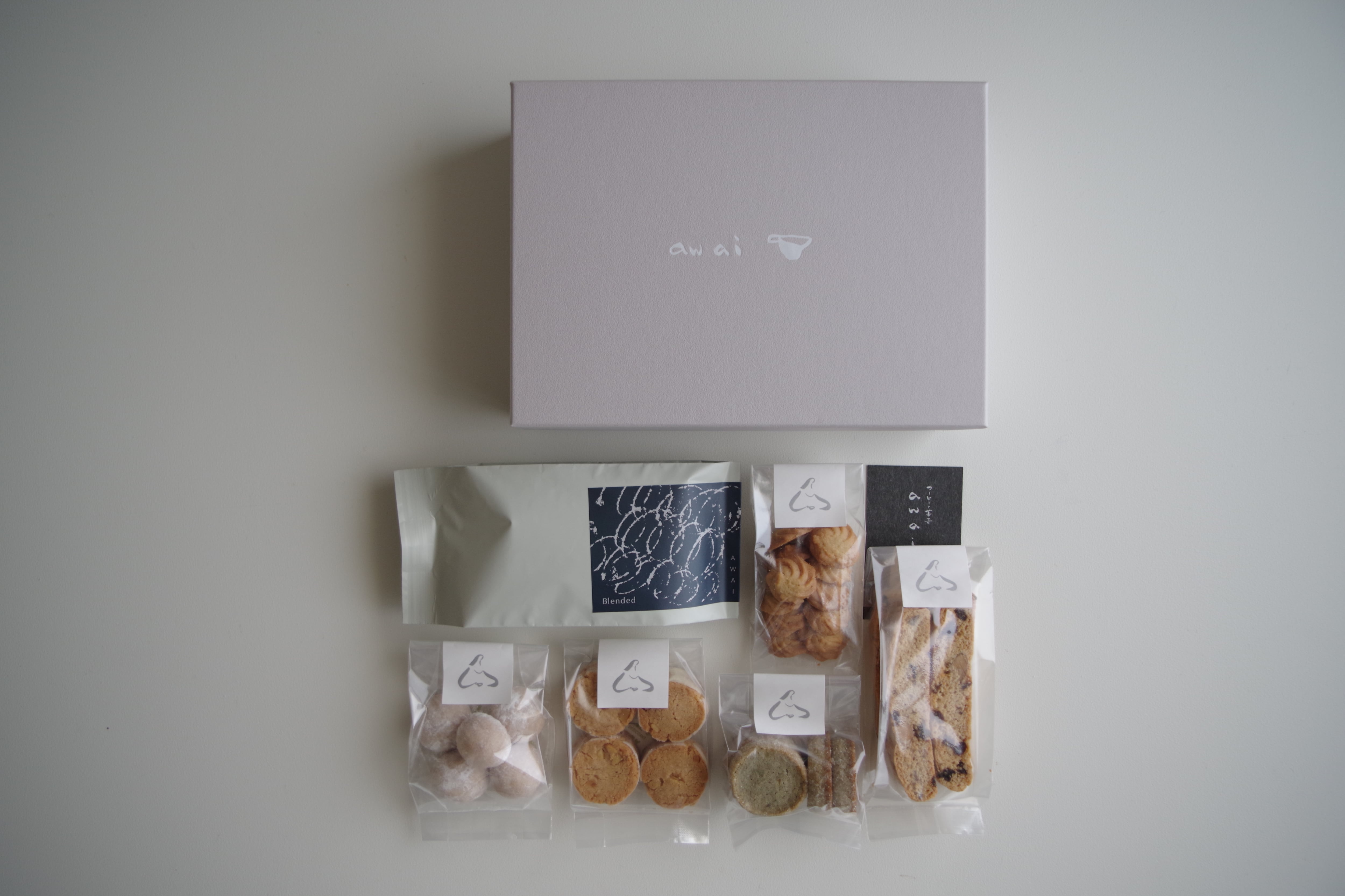 定番でご用意しているブレンドコーヒー豆と、awaiの焼き菓子を詰め合わせました。